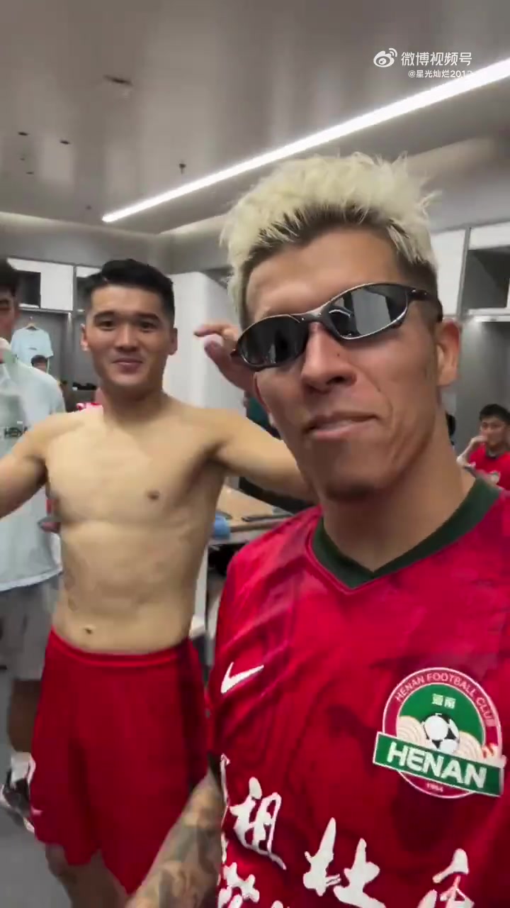 视频中,河南队外助纳萨里奥戴着墨镜领舞,全队在更衣室又唱又跳庆祝收效。