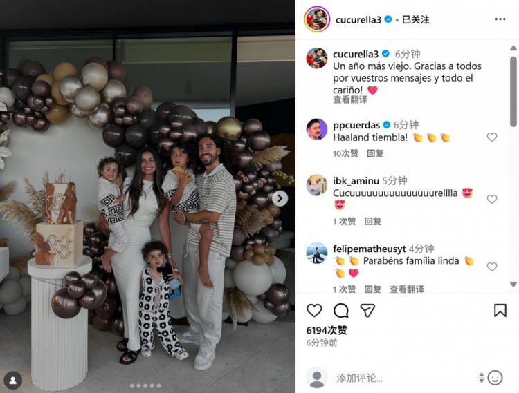 7月23日讯 库库雷利亚昨日迎来27岁生辰,球员也在个东谈主社媒晒出与一家东谈主庆祝生辰的合影。