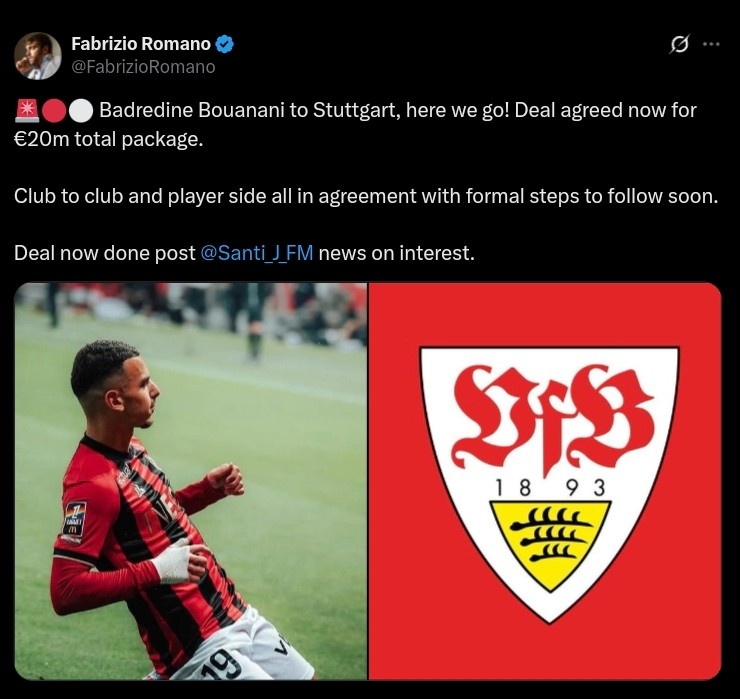 Here we go!罗马诺:斯图加特行将签下尼斯20岁时尚布阿纳尼