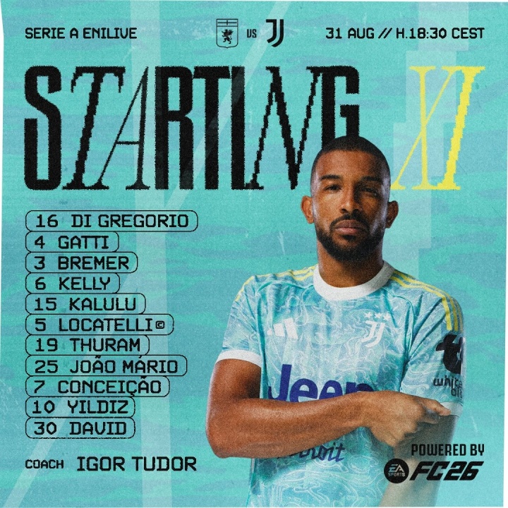 尤文vs热那亚首发:戴维、伊尔迪兹、小孔塞桑出战