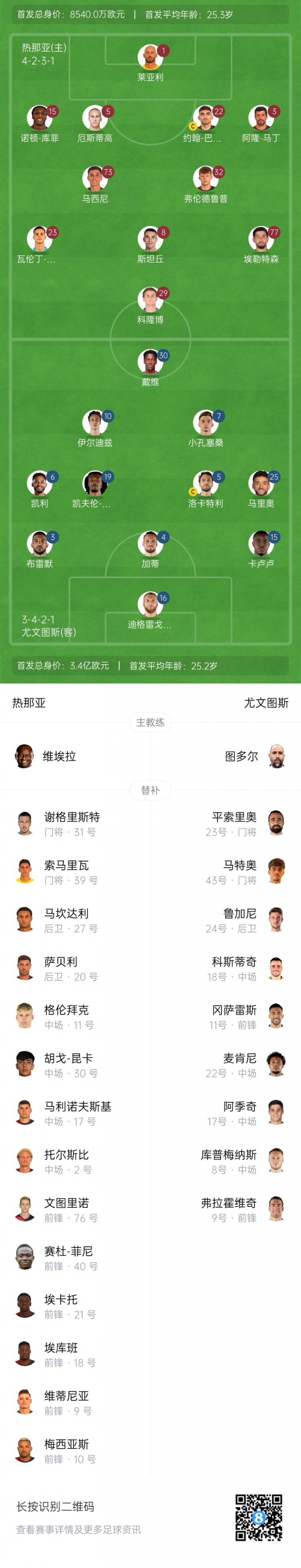 尤文替补:23-平索里奥、24-鲁加尼、46-法昆多-冈萨雷斯、8-库普梅纳斯、11-尼古拉斯-冈萨雷斯、17-阿季奇、18-科斯蒂奇、22-麦肯尼、9-弗拉霍维奇