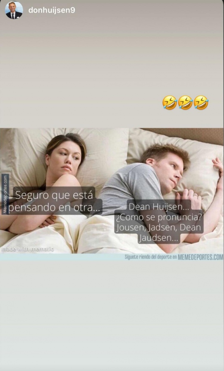 赫伊森贴出的图片中有一双情侣,其中阿谁男的彰着是一个西班牙球迷,他纠结于赫伊森名字的发音(注:赫伊森是小时辰从荷兰移居到西班牙的,他这个姓氏在西班牙很淡薄,而荷兰语和西班牙语的发音有很大辨别):“这个名字该怎么念呢?豪森,哈德森,丹-华森...", 他身旁的女友怀疑他有外遇了:“他笃定在念念别的女孩..."