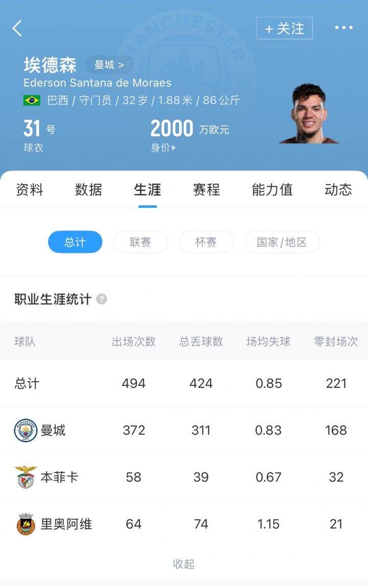 埃德森现年31岁,他与曼城的合同将在来岁到期,现身价2000万欧。2017年夏窗埃德森加盟曼城效劳于今,上赛季在英超出场26次,一共匡助曼城取得过6次英超冠军,1次欧冠冠军、1次世俱杯冠军、4次联赛杯冠军和2次足总杯冠军。