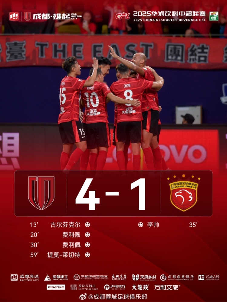 大胜!费利佩双响、韦世豪献助攻,成王人蓉城4-1驯服上海海港