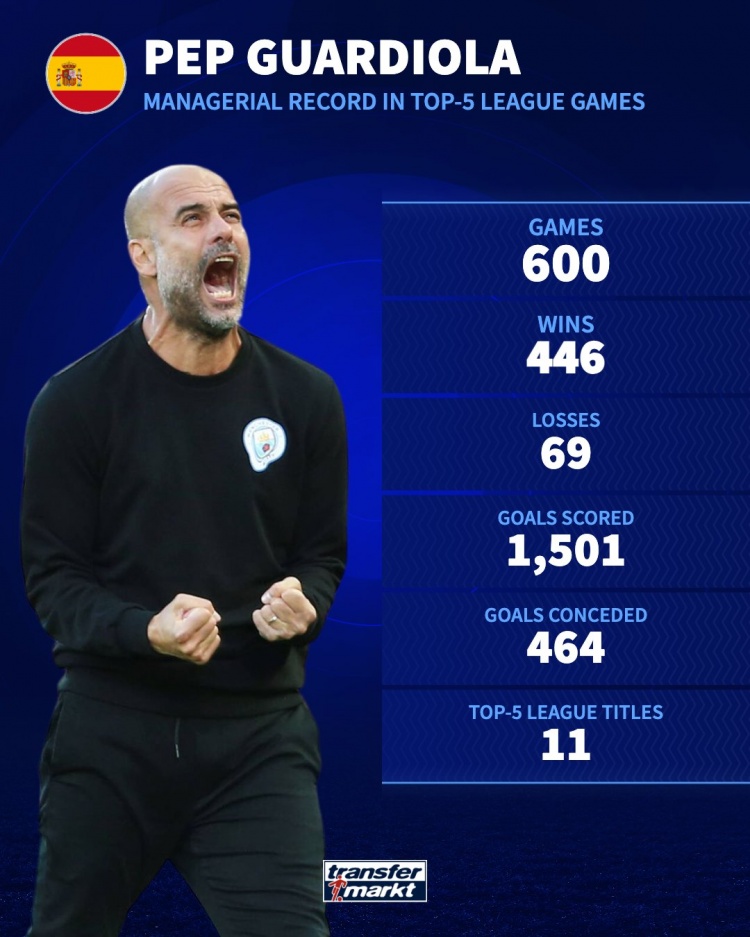 9月15日讯 德国转会市集统计了本世纪五大联赛证据注解的联赛胜率,并排出榜单,瓜迪奥拉握教600场,取胜446场,胜率74%居首。