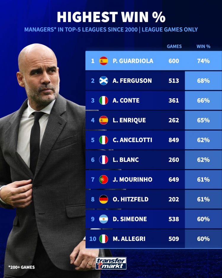 本世纪证据注解五大联赛胜率榜:瓜帅74%居首,弗格森、孔蒂二三位
