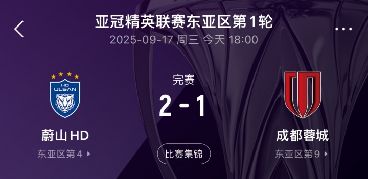 09月17日讯 亚冠精英东亚区第1轮,蓉城1-2遭蔚山逆转,无缘亚冠首分。
