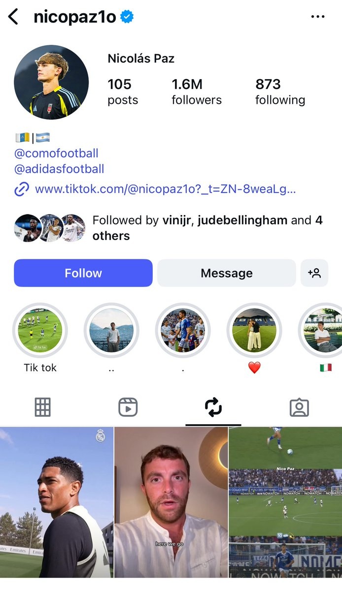 尼科-帕斯社媒转发了皇马的历练视频,这位21岁的阿根廷中场前年以600万欧转会费从皇马加盟科莫,契约中包含回购条件。