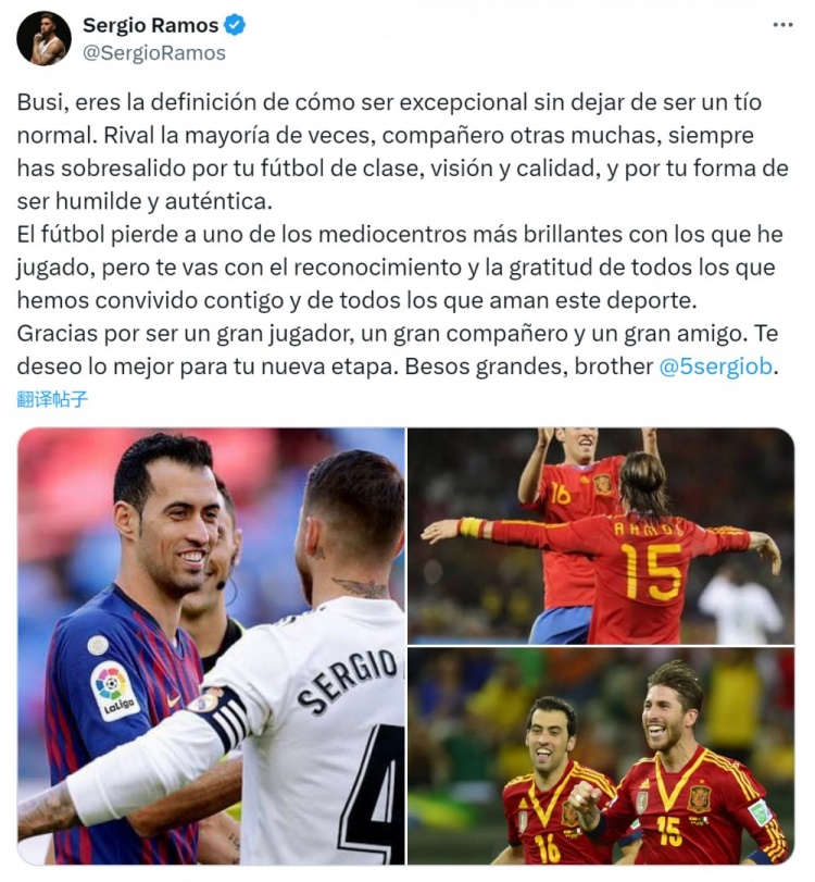 拉莫斯社媒祝愿布斯克茨:我同事过的最了得中场之一,祝改日顺利