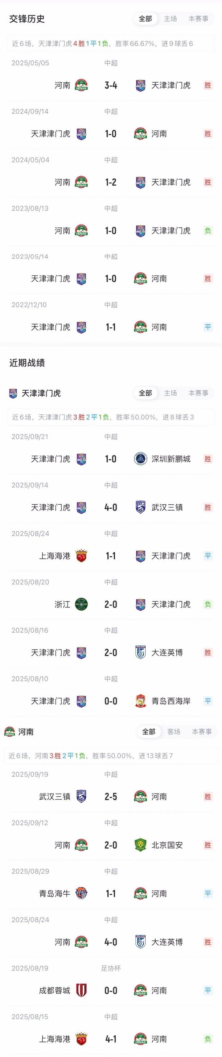 两队近期中超均得到两连胜,津门虎积分40分排在积分榜第6;河南29分排第11。近3次交手,津门虎均打败河南。