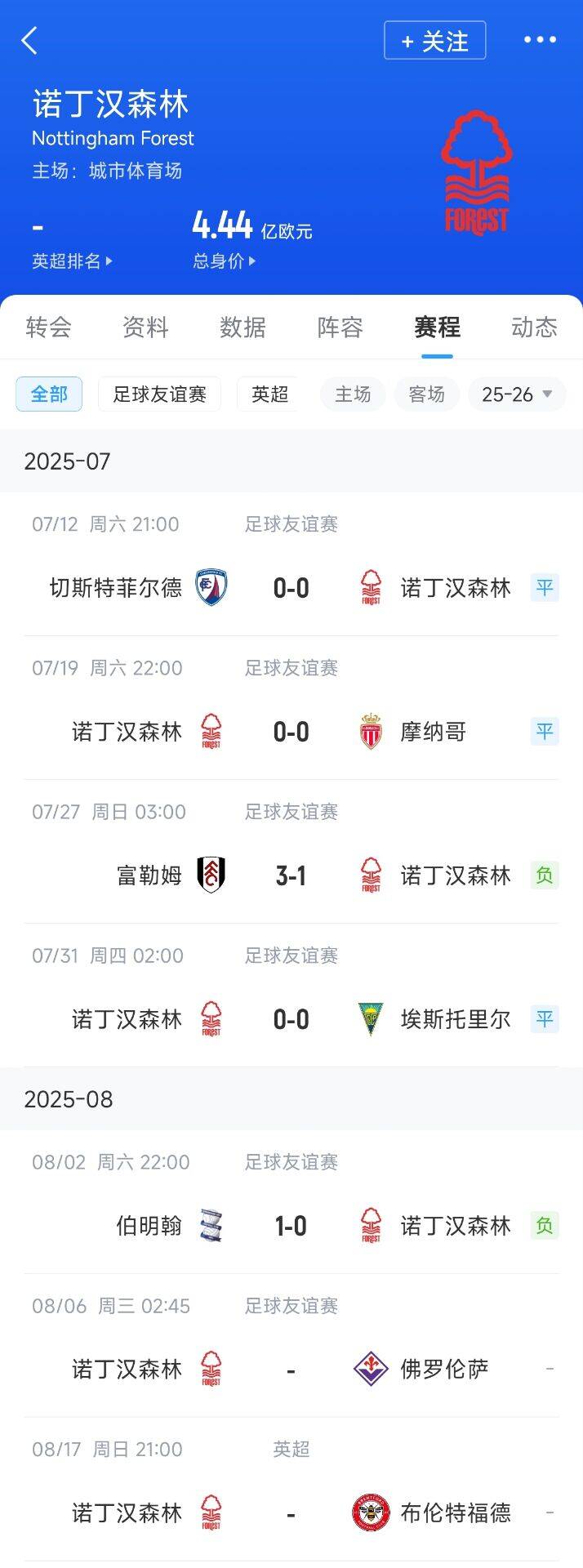 08月03日讯 英超的诺丁汉丛林季前赛5场1场也没赢,3平2负只进了1个球。
