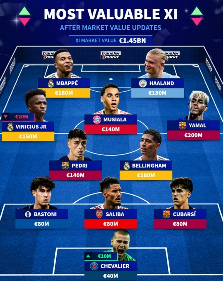 德转列寰宇足坛身价最高阵:姆巴佩、哈兰德领衔,亚马尔在列