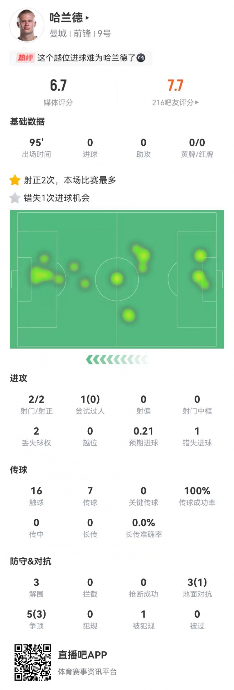 被零封!哈兰德本场2射2正+1失良机 3突围+8抵御4到手 获6.7分