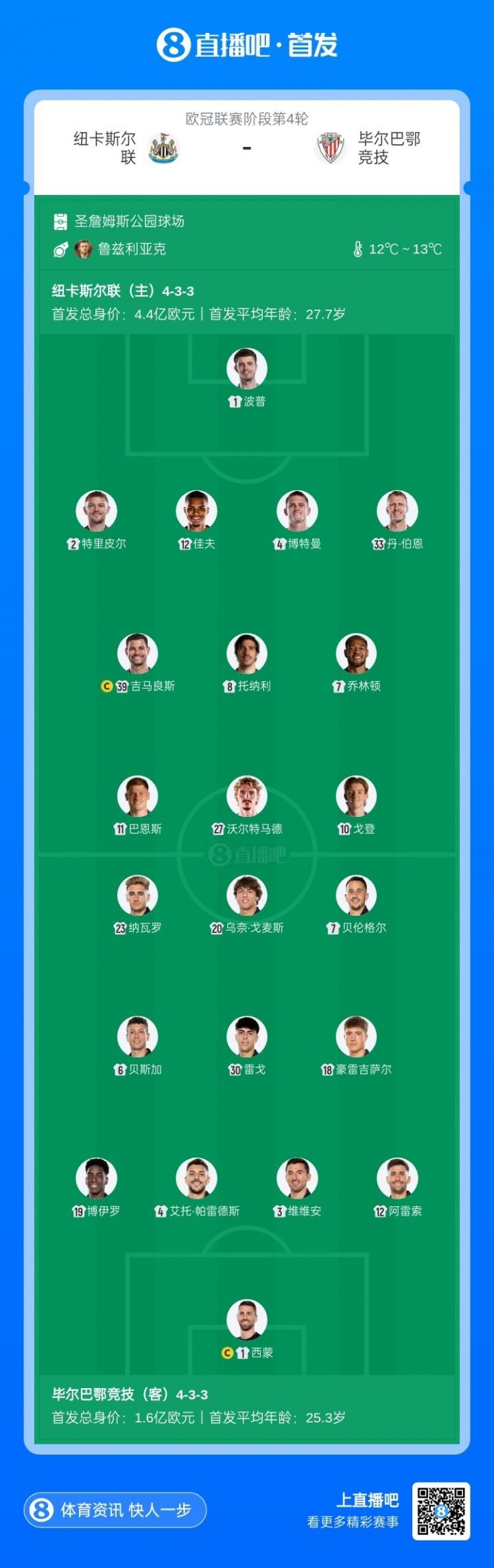 11月06日讯 欧冠联赛阶段第4轮 纽卡斯尔联主场迎战毕尔巴鄂竞技,赛前首发名单公布。