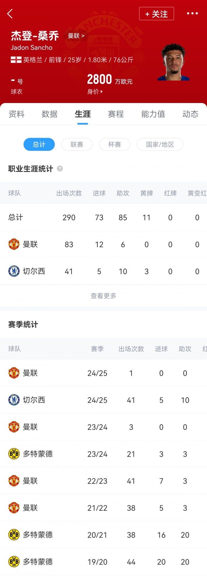 桑乔2021年夏窗以8500万欧元的转会费从多特加盟曼联,2024年冬窗他又被回租至多特。两次着力多特时分,桑乔共为多卓绝战158次,打入53球67助攻。
