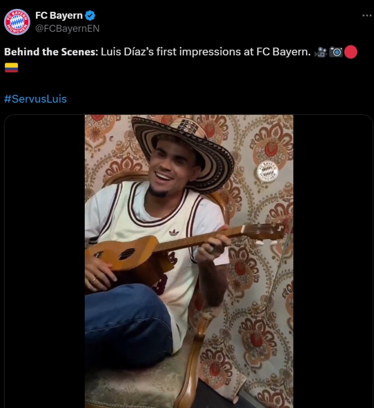拜仁官推晒迪亚斯加盟首日视频集锦:体检、定妆照、弹吉他、签约
