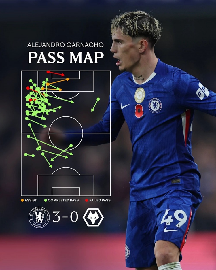 11月10日讯 切尔西在本轮联赛3-0完胜狼队,加纳乔发扬拉风送出2次助攻。