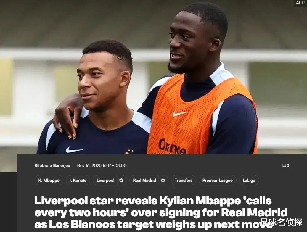 科纳特近日显现,他的本家姆巴佩“每两个小时”就会给他打电话劝说加盟皇马,而利物浦中卫的公约来岁夏天就要到期。