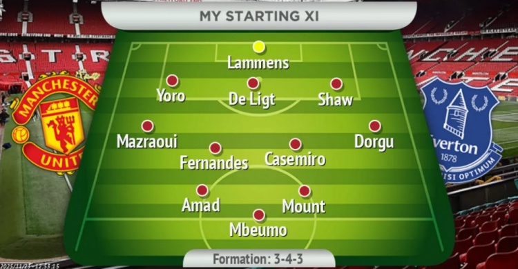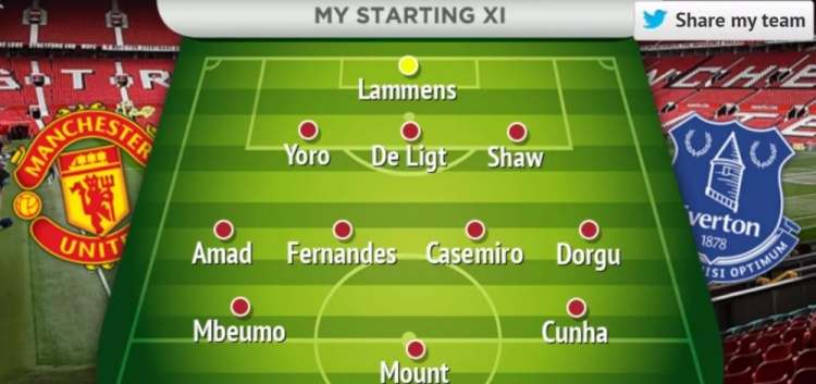 记者Jack Flintham:拉门斯;卢克·肖、德里赫特、约罗;多尔古、卡塞米罗、B费、马兹拉维;芒特、阿玛德、姆伯莫