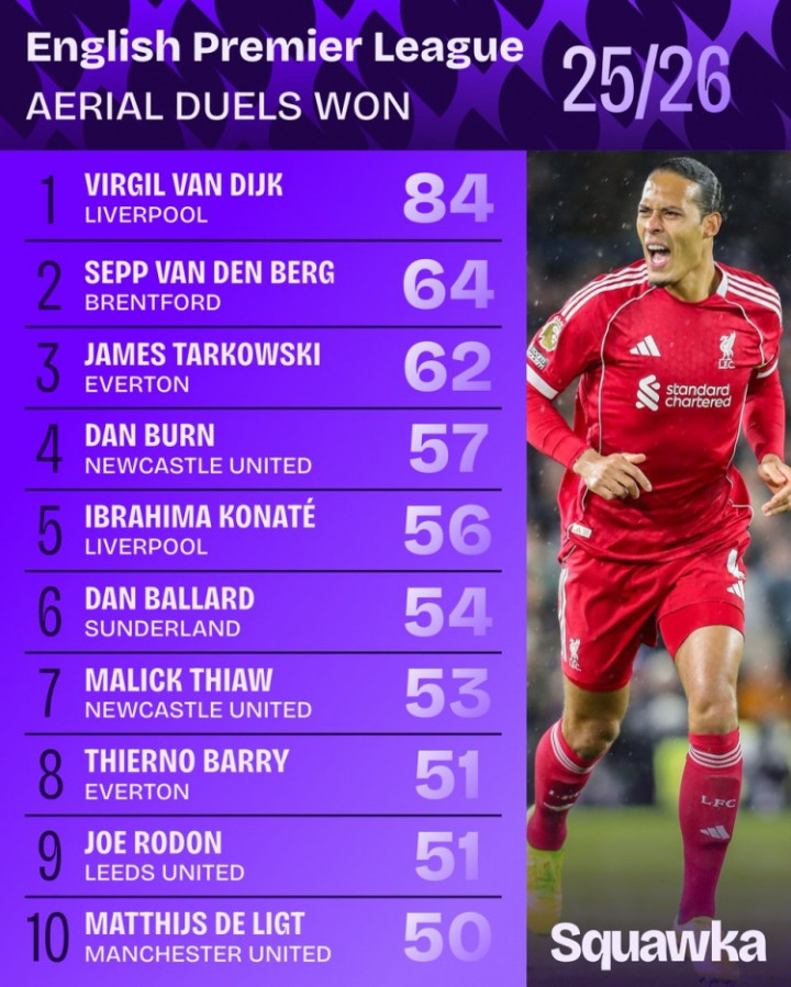 此外,范戴克争顶收效力为80%,在通盘至少参与25次及以上争顶的球员中,收效力最高。