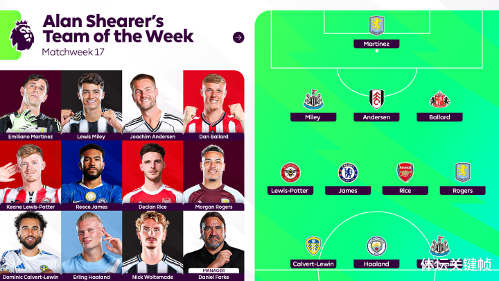 英超第 17 轮的战罢,利兹联主帅法尔克联袂气象火热的勒温不仅赶走了水晶宫的客场听说,更让埃兰路球场成为了本周最大的赢家。除此除外,哈兰德的高效屠戮与摩根・罗杰斯的梅开二度相通熠熠生辉,以下是本周施展最能干的 11 东说念主名单。
