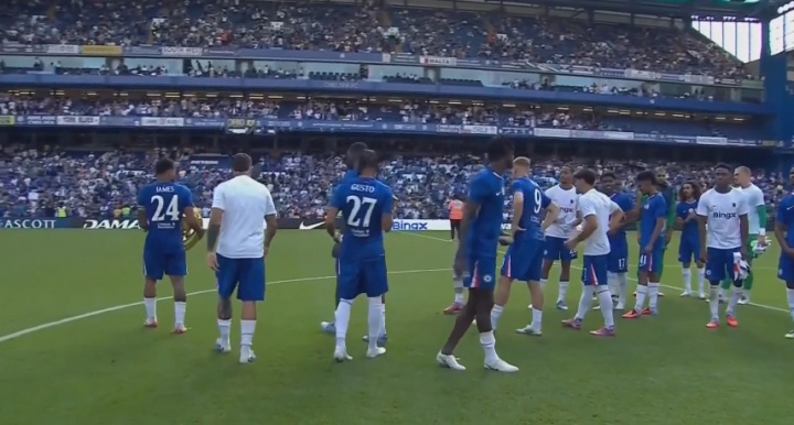赛前切尔西在场面中央展示奖杯↓