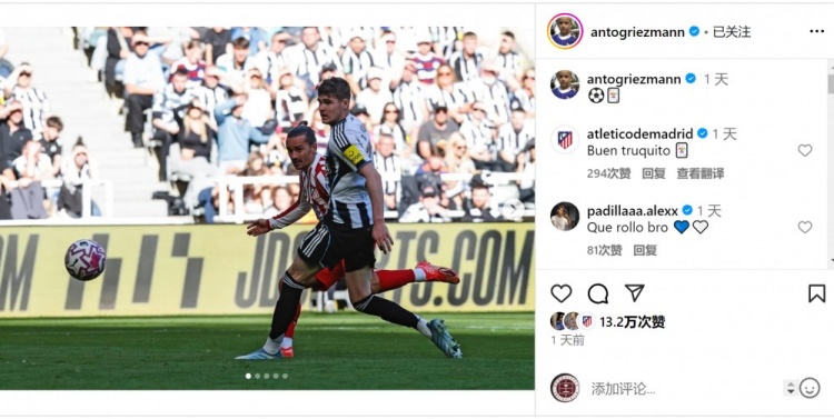 马竞在友谊赛中2-0打败纽卡,此役得回进球的格列兹曼更新社媒动态,晒出比赛像片,以及我方在球场上手拿梅西球星卡的像片。