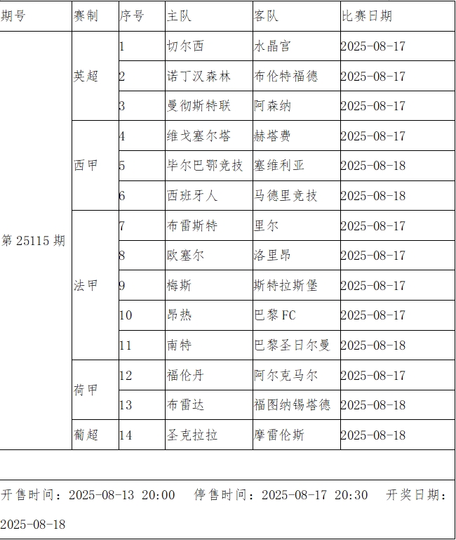 本周末,西甲、英超和法甲记忆,五大联赛拉开新赛季帷幕,寰球足坛的眼神再行聚焦欧洲大陆。周日传足赢输彩第25115期竞猜对象为英超、西甲、法甲以及荷甲、葡超赛事。本期对阵中,曼联阿森纳的强强对话尤为引东谈主顾惜。此外切尔西和巴黎圣日尔曼也接踵出战。