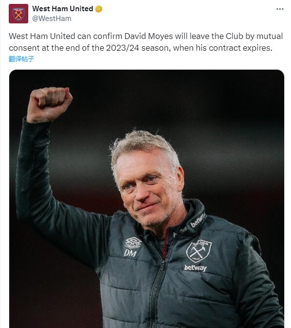在前年的5月,西汉姆晓谕将在赛季末与功勋主帅莫耶斯离异。当时刻的莫耶斯,是西汉姆场均得分最高的主帅(抓教20场以上)。他还率西汉姆取得队史最高的英超名次,并荟萃两年进前7。此外他还匡助铁锤帮夺得欧协联冠军,这亦然西汉姆自1980年的足总杯后的第一个紧迫赛事冠军,亦然球队自1965年来的首个欧战奖杯。