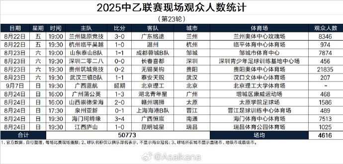2025中乙联赛现场不雅世东说念主数统计(第23轮)(1场延期)