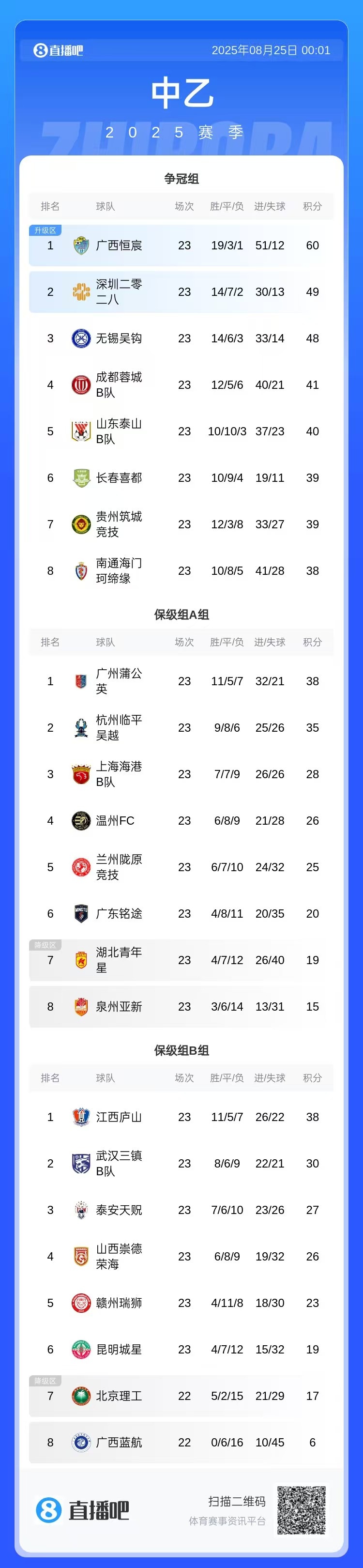 8月24日讯 中乙决赛阶段第23轮比赛适度,广西恒宸和深圳二零二八暂居争冠组前二,湖北后生星和泉州亚新暂列保级A组后两名,北京理工和广西蓝航在少赛一场的情况下暂列保级B组后两名。