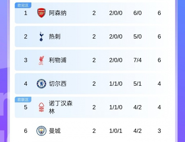 08月27日讯 英超2轮战罢,现存3支球队全胜,阿森纳、热刺和利物浦分列前三。4/5/6名分离是切尔西、丛林和曼城。