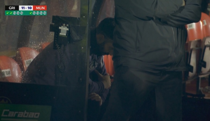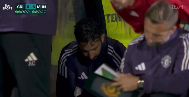 点球大战进行中时,镜头给到阿莫林,阿莫林坐在栽种席上,他低着头莫得看向场上。