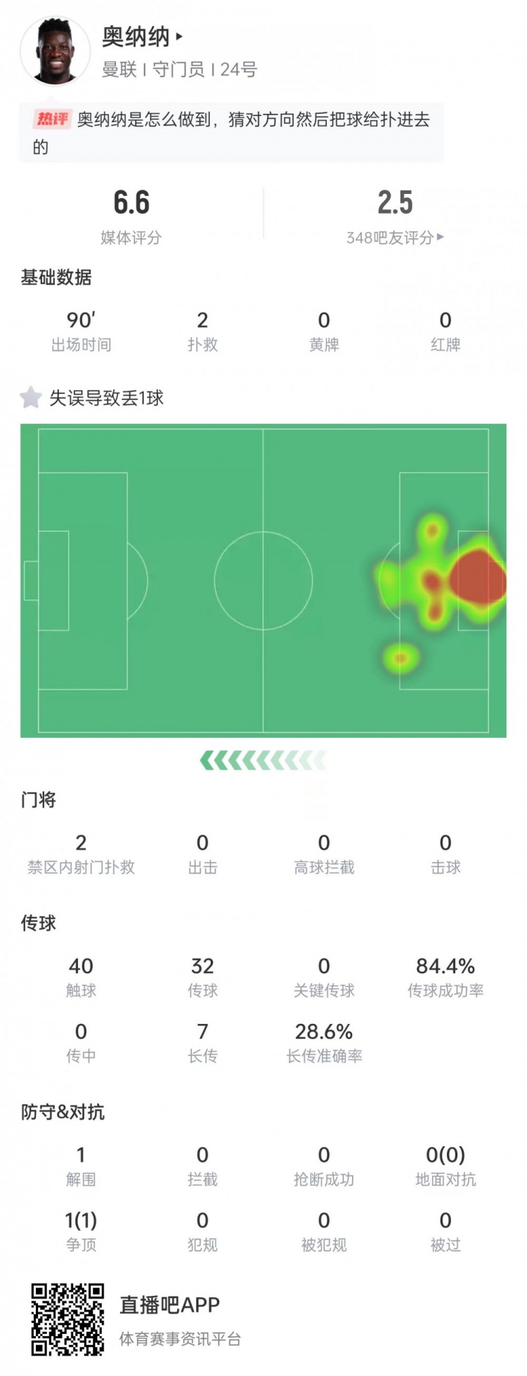 奥纳纳本场数据:作念出2次扑救&出击舛错导致丢球,获评6.6分