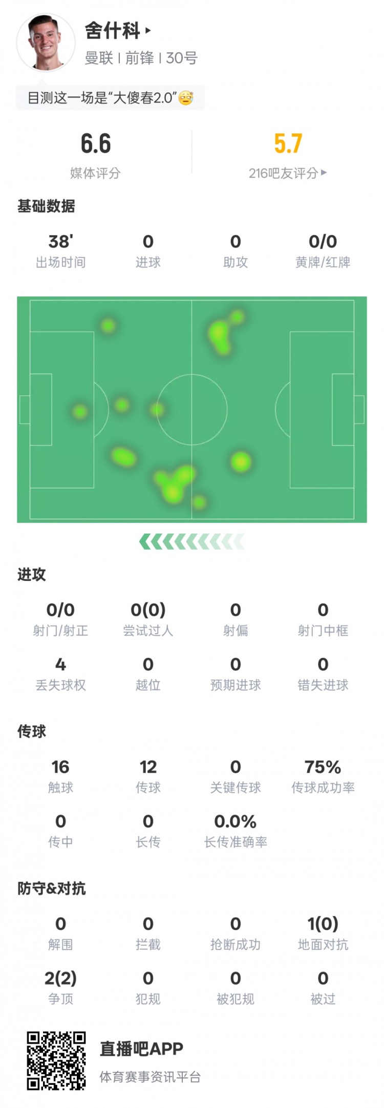 8月25日讯 2025-26赛季英超第2轮,曼联客场1-1富勒姆。舍什科替补出战,多项数据挂零,独一2次争顶均得胜。