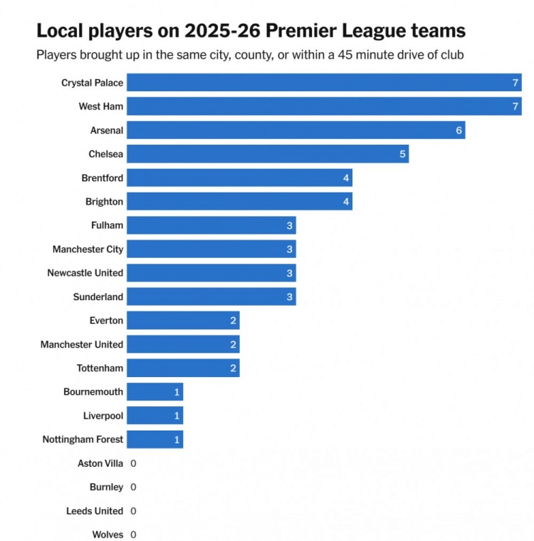 9月9日讯 日前,The Athletic统计了英超各队土产货球员东说念主数(球队场地地同城、同地区、距离俱乐部45分钟车程的土产货球员)。