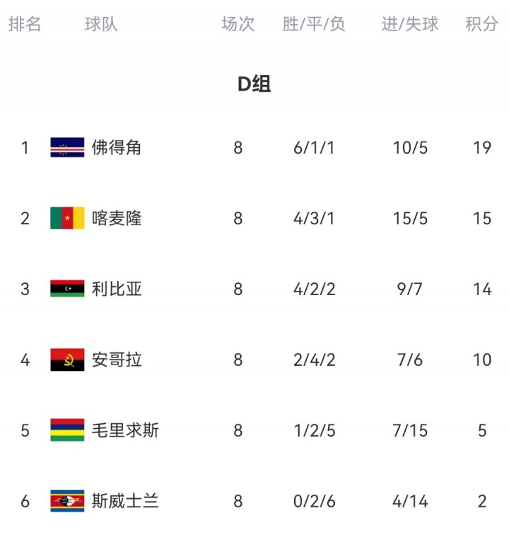 在积分榜上佛得角8轮19分领跑,喀麦隆15分位居第2,比赛还剩终末两轮,独一小组第一智力纵贯2026寰宇杯,而小组第二要与其他组的第二竞争,9组中4个获利最佳的小组第二进行附加赛,争夺一个跨洲附加赛的限额。