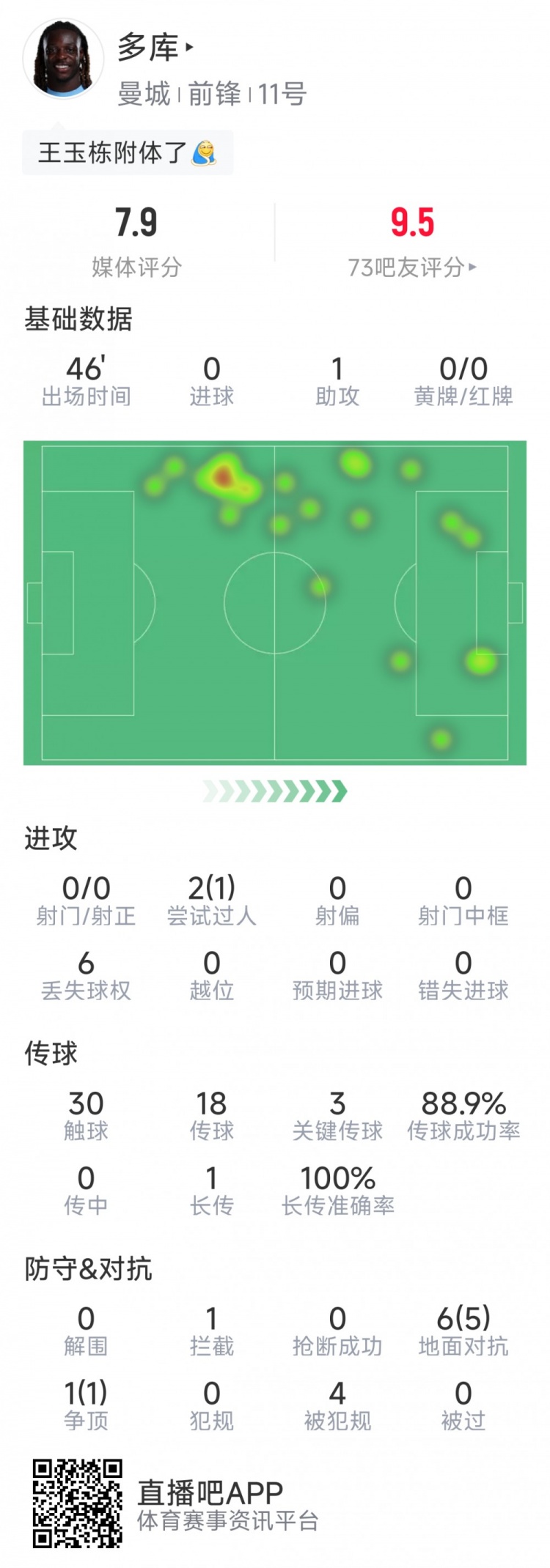 多库半场数据:1次助攻,3次要道传球,7次反抗6次收效