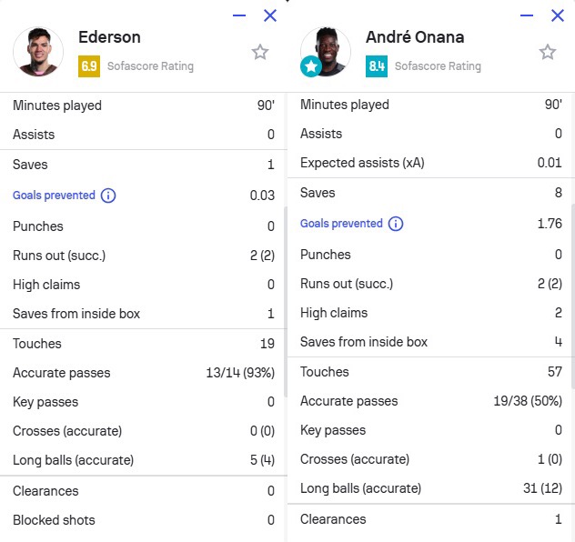 本场比赛,奥纳纳57次触球,38次传球19次得胜,传球得胜率50%,31次长传12次得胜。对面的埃德森则是19次触球,14次传球13次得胜,传球得胜率93%,5次长传4次得胜。
