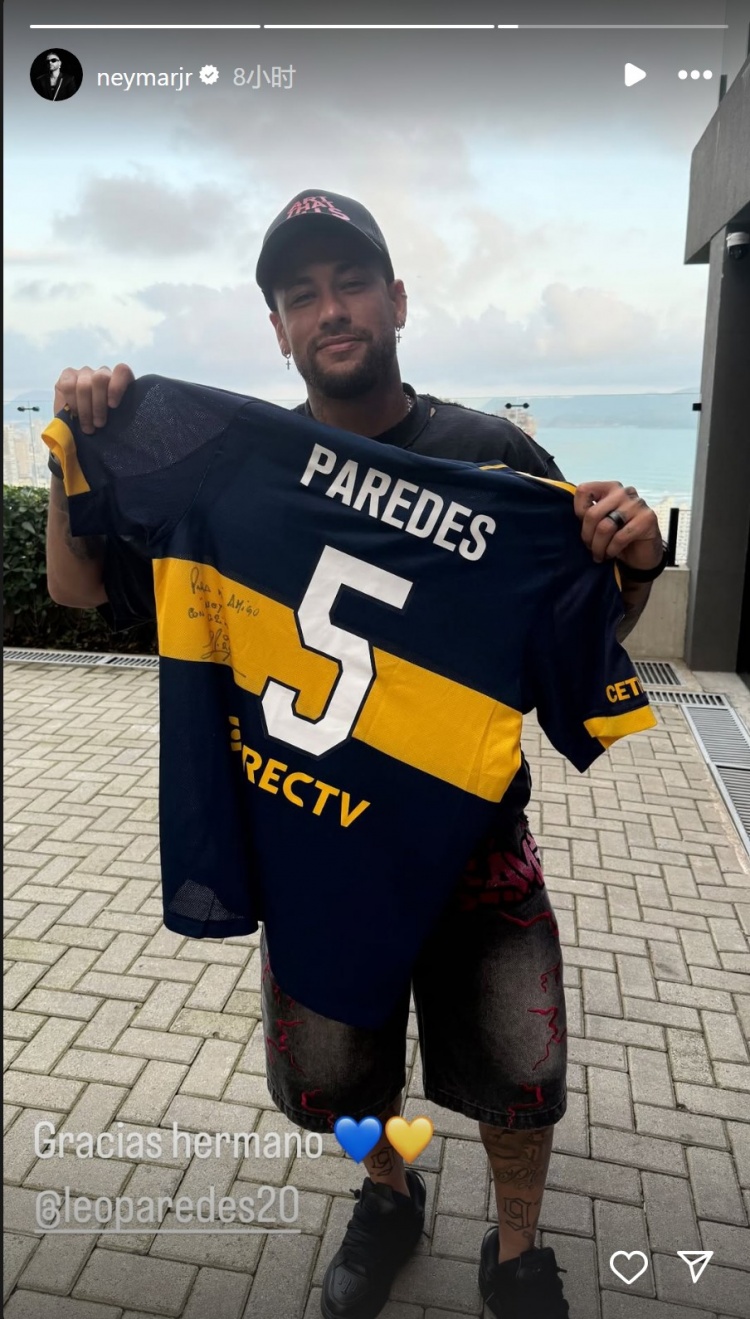 内马尔也晒起先拿帕雷德斯球衣的像片,配文:“感谢昆季。”