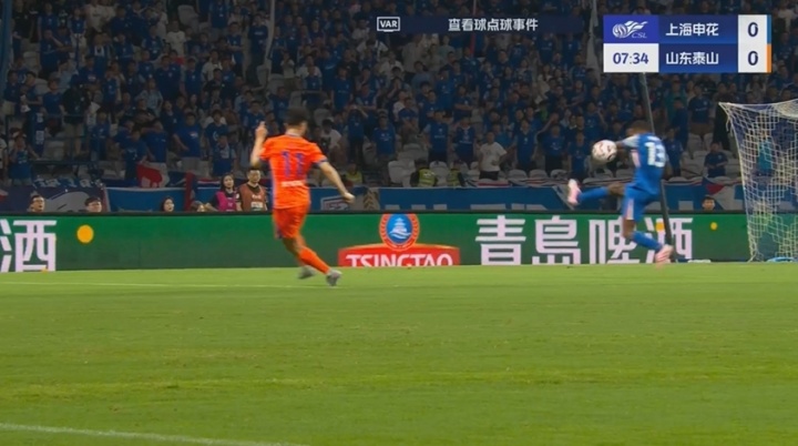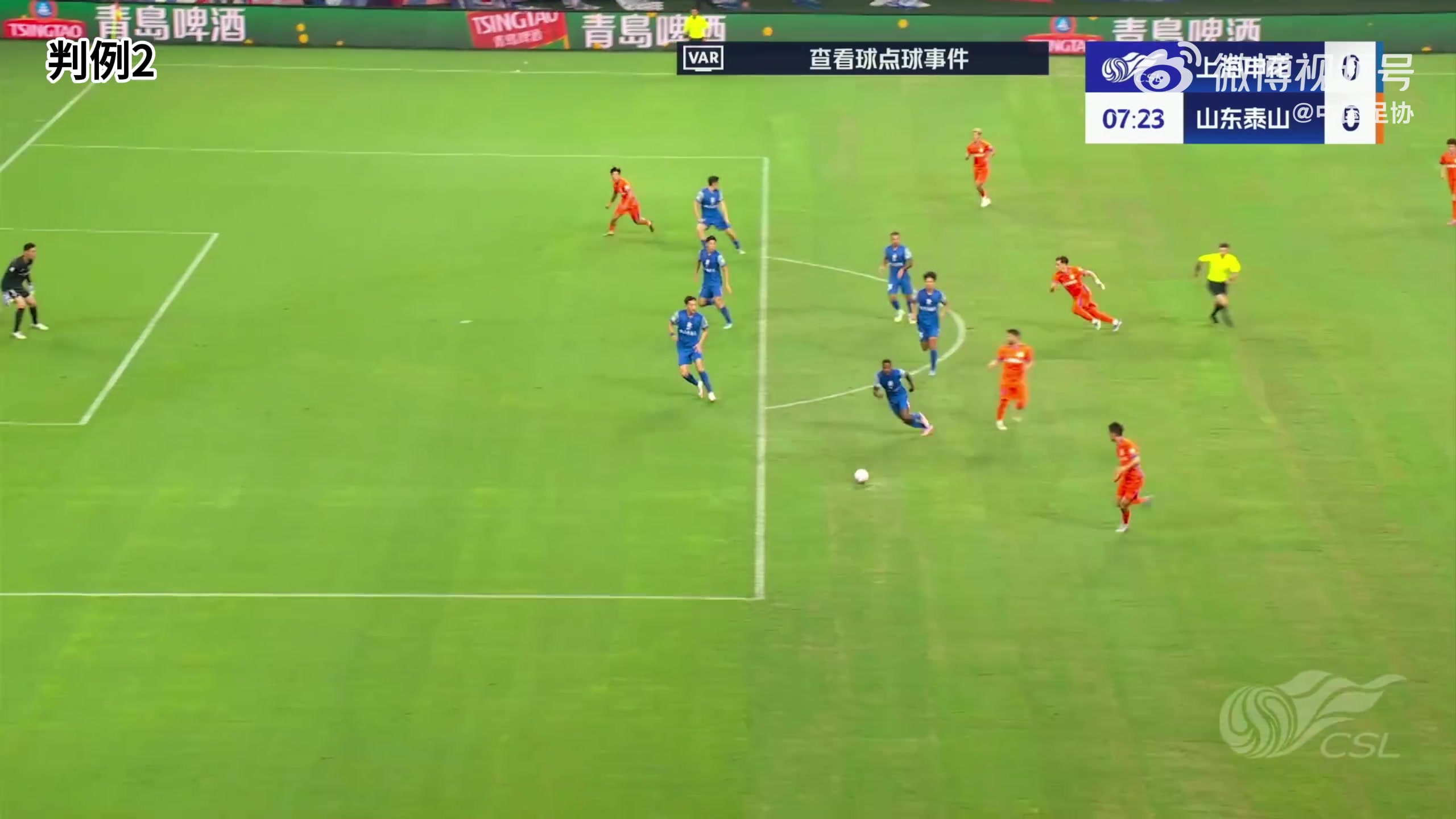 判例二:中超联赛第24轮,上海申花VS山东泰山,比赛第7分钟,山东泰山11号队员进攻中传中,球疑似战役处在罚球区内的上海申花13号队员手臂。评判员未判罚手球犯规,VAR未介入。