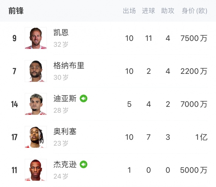 拜仁锋线五东说念主↓(不含穆西亚拉)