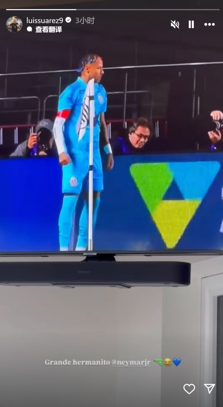 苏亚雷斯更新社媒动态,晒出内马尔庆祝进球的视频,为老队友奉上饱读舞,配文:“了不得的昆季,内马尔。”