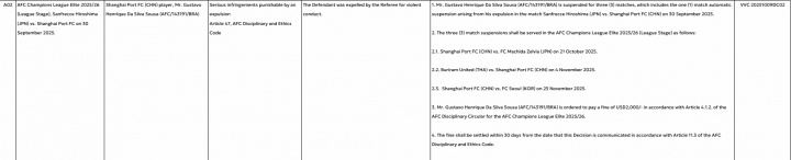1-古斯塔沃因在对阵广岛三箭时被罚下,将被禁赛三场,其中包括一场自动停赛,这三场禁赛将在25-26赛季亚冠小组赛中扩充。