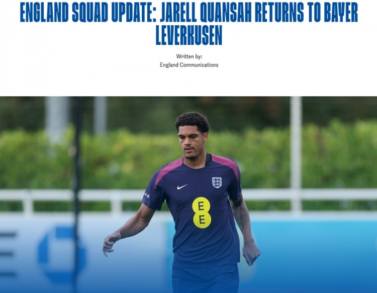 官方:宽萨因伤退出英格兰队复返勒沃库森,球队暂无增补球员策动