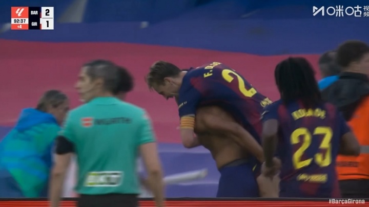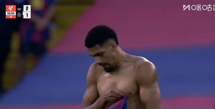 绝杀进球俄顷,阿劳霍神气脱衣庆祝,巴萨全队也堕入跋扈庆祝中。