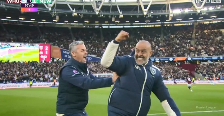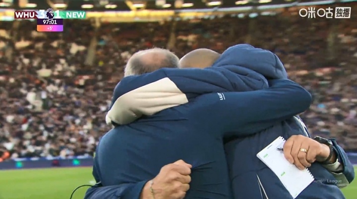 下半场补时第5分钟,绍切克补射破门匡助西汉姆锁定胜局,主帅努诺在场边与教练组欢乐相拥。