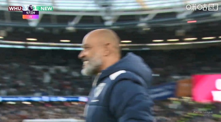 阻截易!得到上任西汉姆联后首胜,努诺场边与教练组欢乐相拥