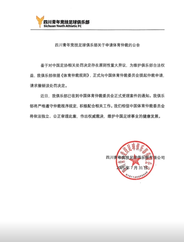 四川后生竞技足球俱乐部对于苦求体育仲裁的公告