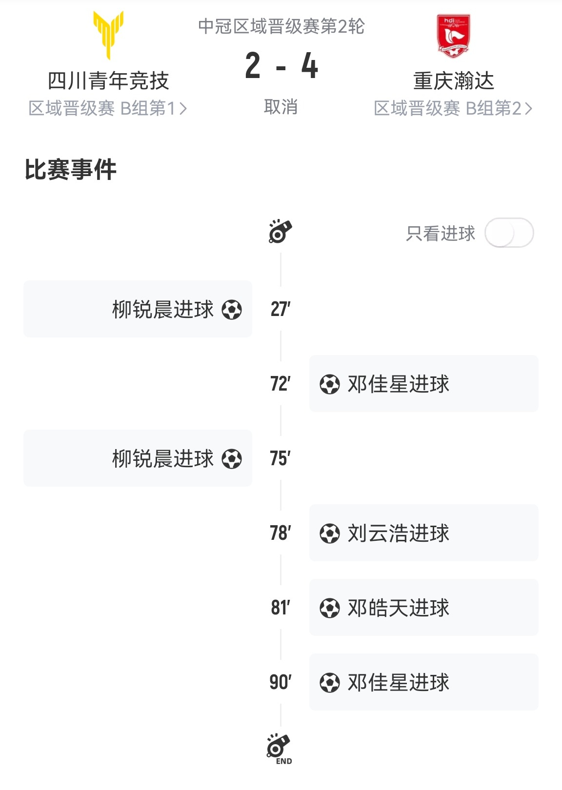 6月20日,中冠官方发布通报,6月3日中冠四川后生竞技 2-4 重庆瀚达的比赛中,经内行组评定,四川后生竞技队在该场比赛中非闲居比赛(悔过比赛)。